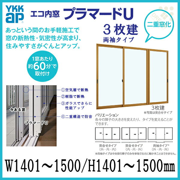 [スマホエントリーでポイント10倍 5/25 10:00-6/1 9:59]二重窓 内窓 プラマードU YKKAP 3枚建突合せタイプ(単板ガラス) 透明3mmガラス W4401〜4500 H1301〜1400mm 各障子のWサイズをご指定下さい YKK サッシ