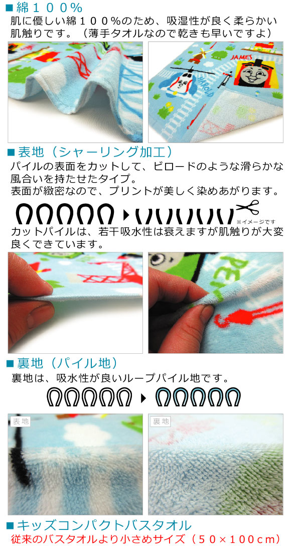 ●商品説明 ・キャラクターコンパクトバスタオル ・キャラクター:きかんしゃトーマス ・サイズ:約50×100cm ・素材:綿100% ●備考 ■綿100%肌に優しい綿100%のため、通気性・吸湿性が良くやわらかな肌触りです。