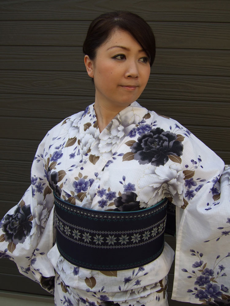 仕立て上がり・ふっくらさん浴衣「白地に黒と白の芍薬」