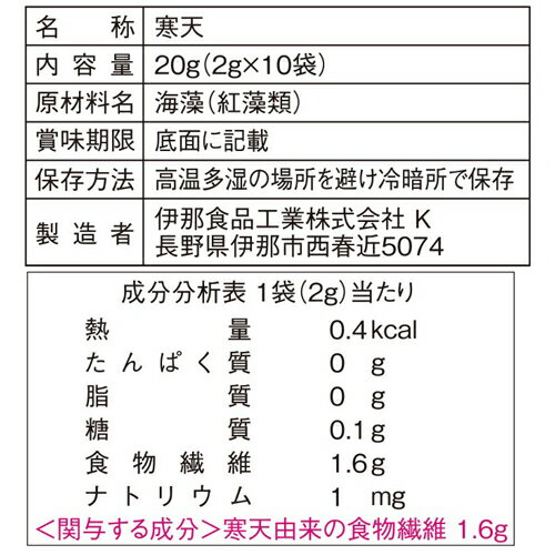 保存方法高温多湿の場所を避け冷暗所で保存原材料名・栄養成分等●名称:寒天●原材料名:海藻(紅藻類)●成分分析表:1袋(2g)当たりエネルギー 0.4kcal、たんぱく質 0g、脂質 0g、糖質 0.1g、食物繊維 1.6g、ナトリウム 1mg【関与する成分】寒天由来の食物繊維 1.6gお問い合わせ先●お客様サービス係フリーダイヤル:0120-321-621●製造者伊那食品工業株式会社長野県伊那市西春近5074ブランド:かんてんぱぱ楽天24>健康食品>植物由来>海藻類>寒天(かんてん)>かんてんぱぱ お湯で溶ける粉末寒天 2g×10袋製造元:伊那食品工業内容量:20g(2g×10袋)JANコード: 4901138881768賞味期限等の表記について「西暦年/月/日」の順番でパッケージに記載。