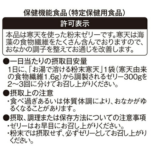 お召し上がり方●一日当たりの摂取目安量1日に、「お湯で溶ける粉末寒天」1袋(寒天由来の食物繊維1.6g)から調製されるゼリー300gを2-3回に分けてお召し上がりください。