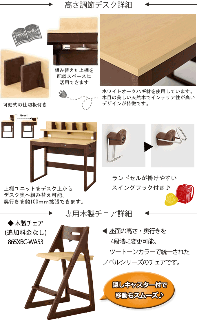 【文具セット+購入特典】オカムラ ノベル 【チェアセット】100デスク+チェア 学習机 865XAT+865XBC NOVEL 岡村製作所 2018年度/おしゃれ/okamura/オーク/ツートン/広さ調節/10cm拡張/木製チェア/デスク【送料無料】