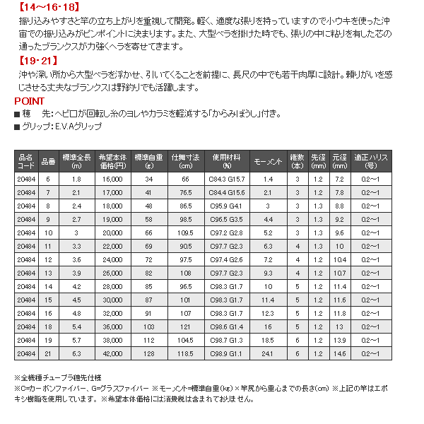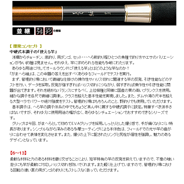 へら竿の調子体系の中でもちょうど真ん中に属する調子は使い手を選ぶことなく、浅棚からチョーチン、底釣りまであらゆる釣りにご使用いただけます。