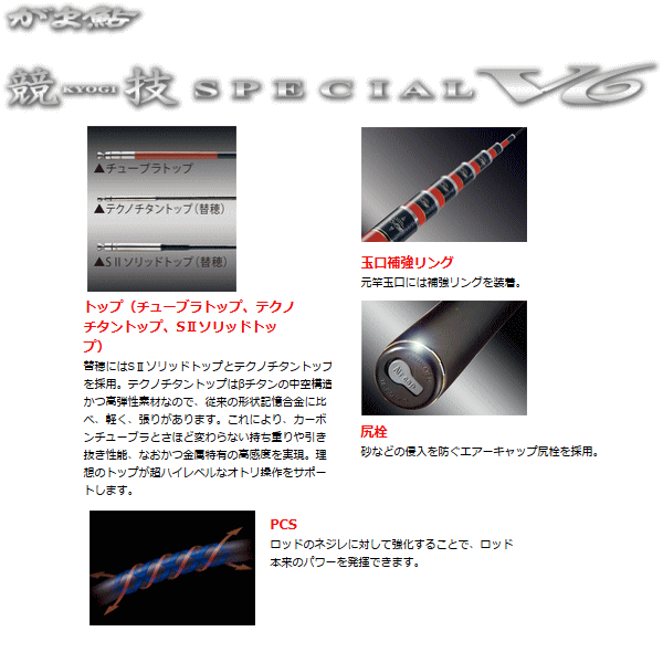 V5から引き継がれたエクストラセンサーやスタビライザーシステムを搭載した上で、 鮎釣りに求められる感度、持ち重りの無さ、オトリの引き性能、掛かり鮎の引き抜き性能、コントロール性能をもはや究極とも言える超高次元なレベルに設定しました。